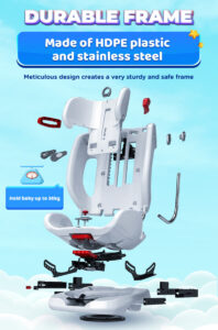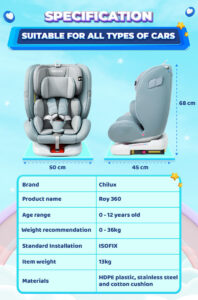 Material : Chilux Roy 360 Car Seat is made of Safe & Non Toxic Plastic used for all parts (PU, PP, HDPE – safe and non-toxic plastic types).